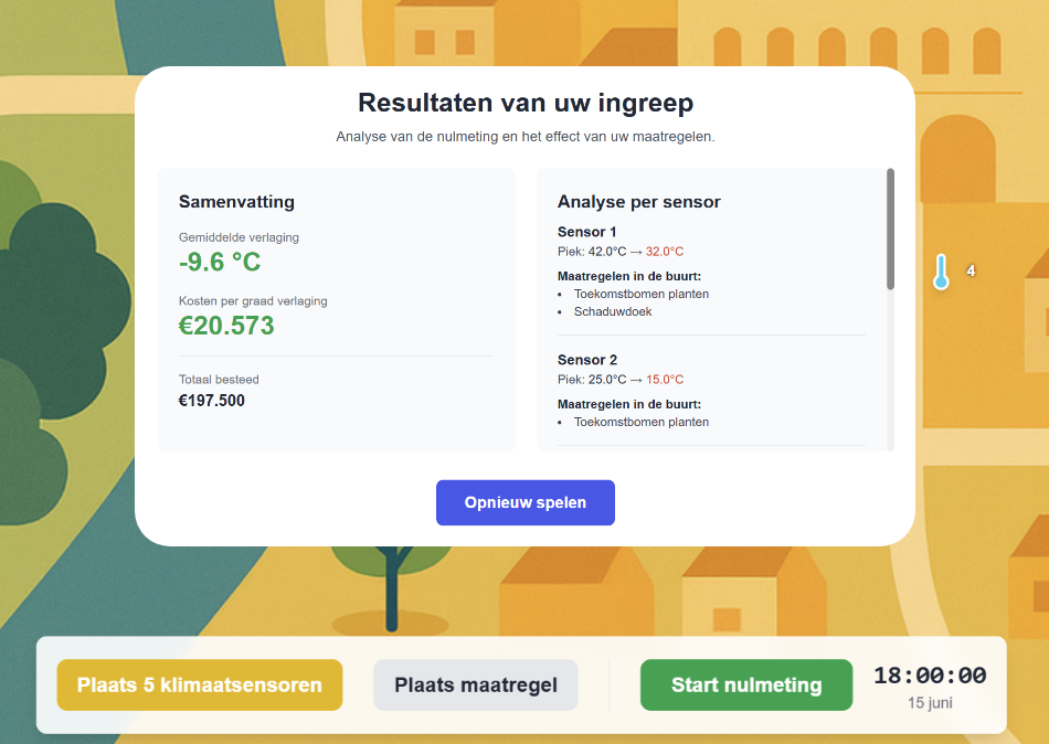 Hoe verlaag je de gevoelstemperatuur in een drukke wijk? In Zonnedael kies je meetlocaties, ontdek je de grootste hittestress-hotspots en probeer je met een beperkt budget zoveel mogelijk effect te bereiken met onder andere bomen, schaduwdoeken of lichte bestrating.