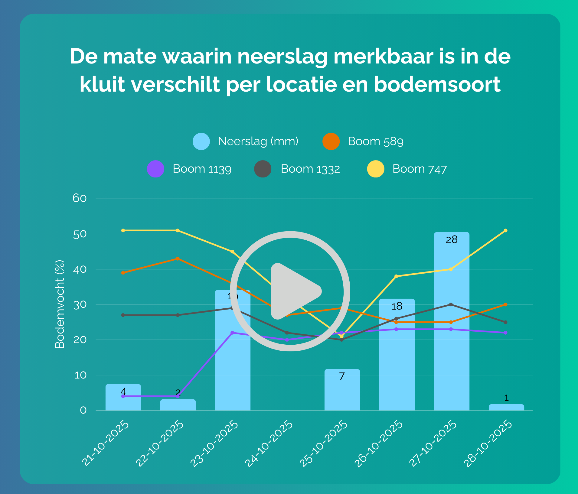 Deze maand laten we zien hoe regenval samenhangt met het bodemvocht op verschillende locaties. Je ziet direct hoe snel de bodem reageert op neerslag en hoe lang het duurt voordat het vocht weer terugloopt. Dat geeft inzicht in droogtegevoeligheid en helpt om watergeven beter te plannen.