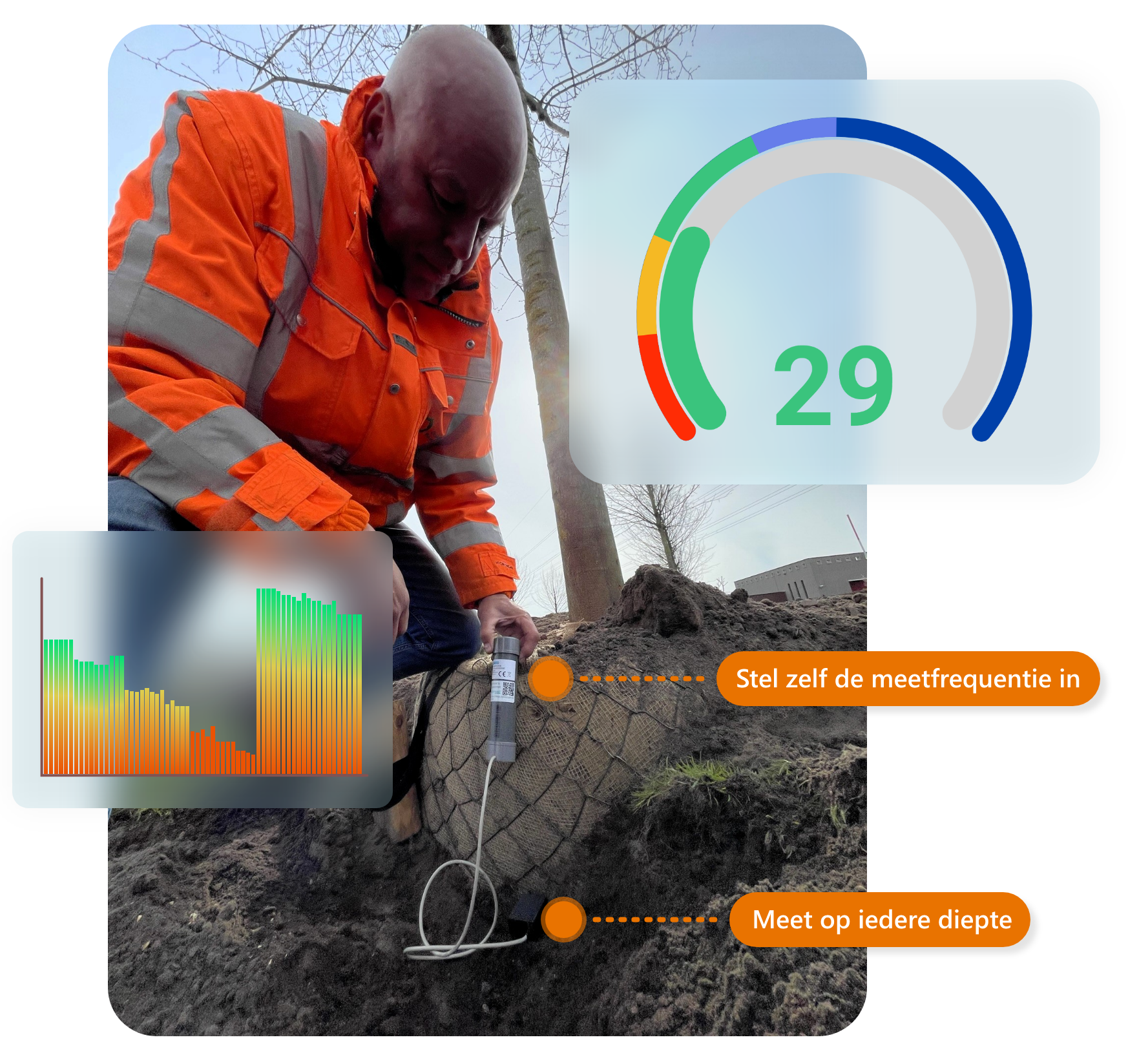 De sensoren meten het bodemvochtpercentage op de gewenste diepte in of rond de kluit. Zo wordt inzichtelijk of een boom daadwerkelijk water nodig heeft, in plaats van te werken op gevoel of vaste rondes.